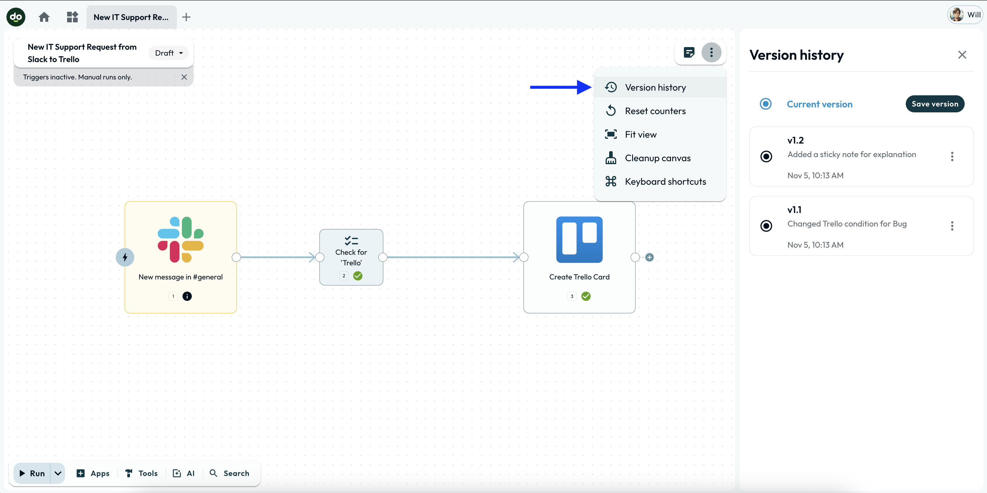 Open Version History, click Save current workflow to create a snapshot, give it a name and description, and restore any snapshot later with a single click. Simple, safe, reversible.Best Practices